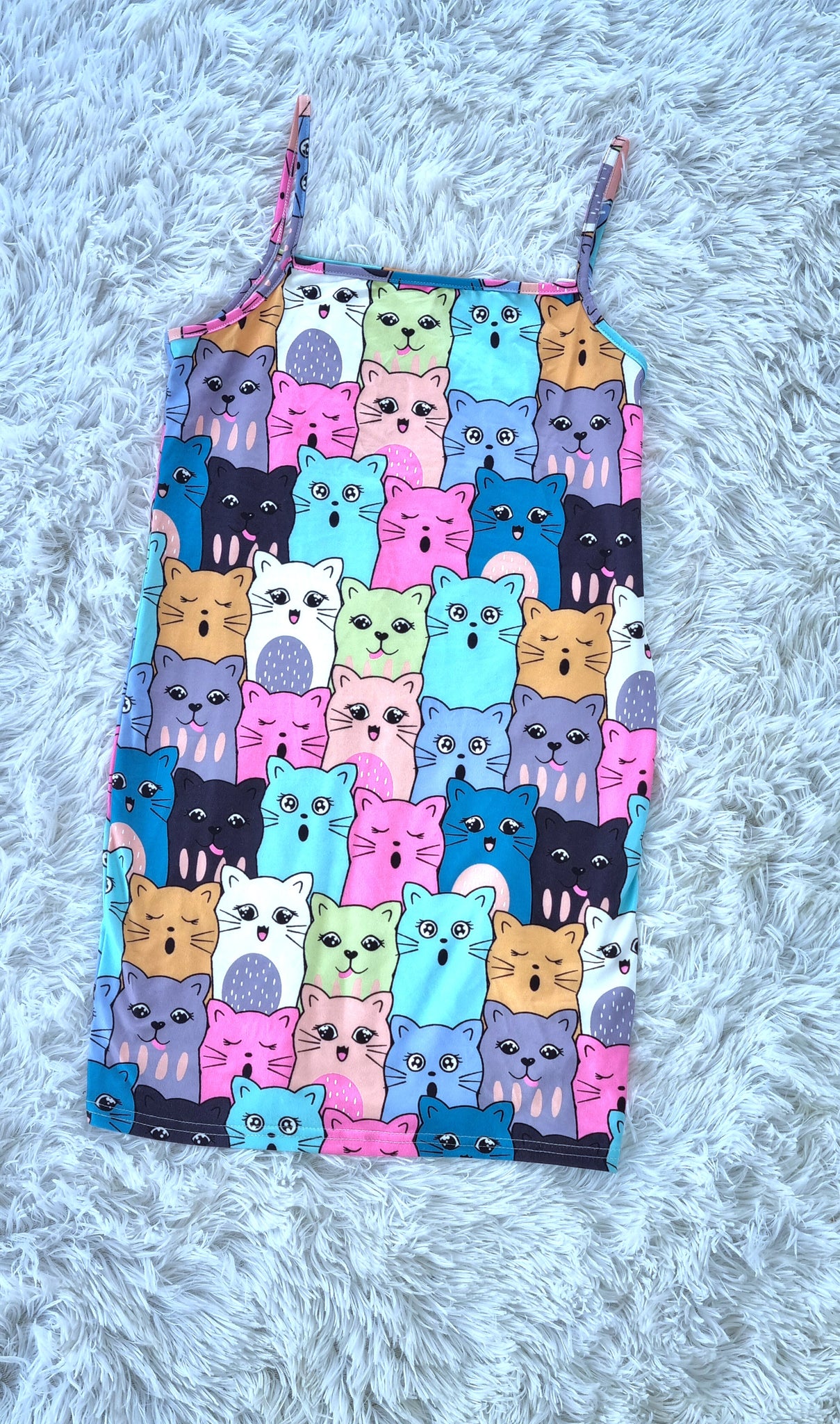 Timeless Kids Cartoon Cat Printed Sphagetti Sleeve Dress
