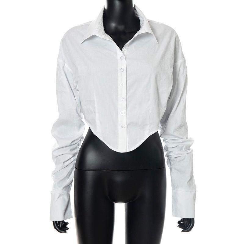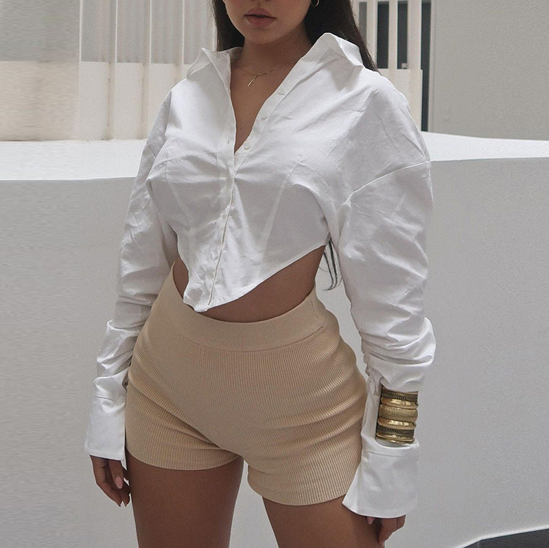 W21tp215 European and American women's wear 2021 summer new solid color Lapel off shoulder sleeve buckle open waist loose shirt