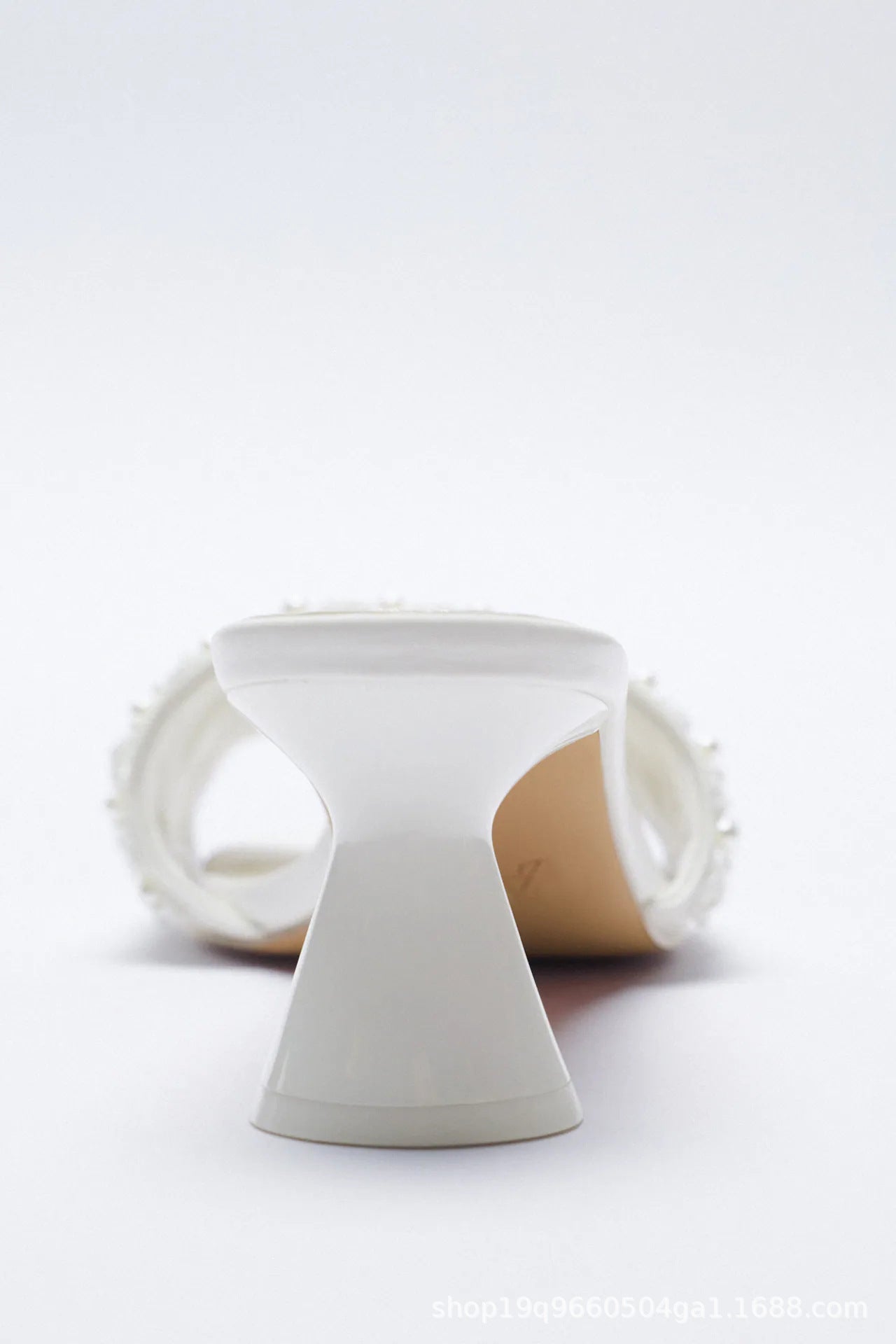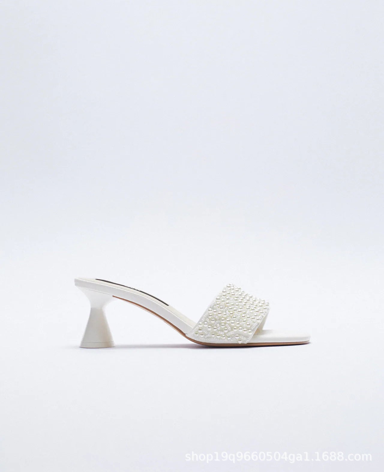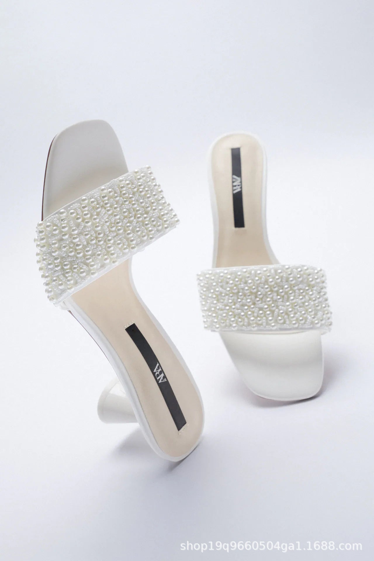 Zar spring and summer new women's shoes with white artificial pearl decoration, thick heel square head semi trailer casual sandals