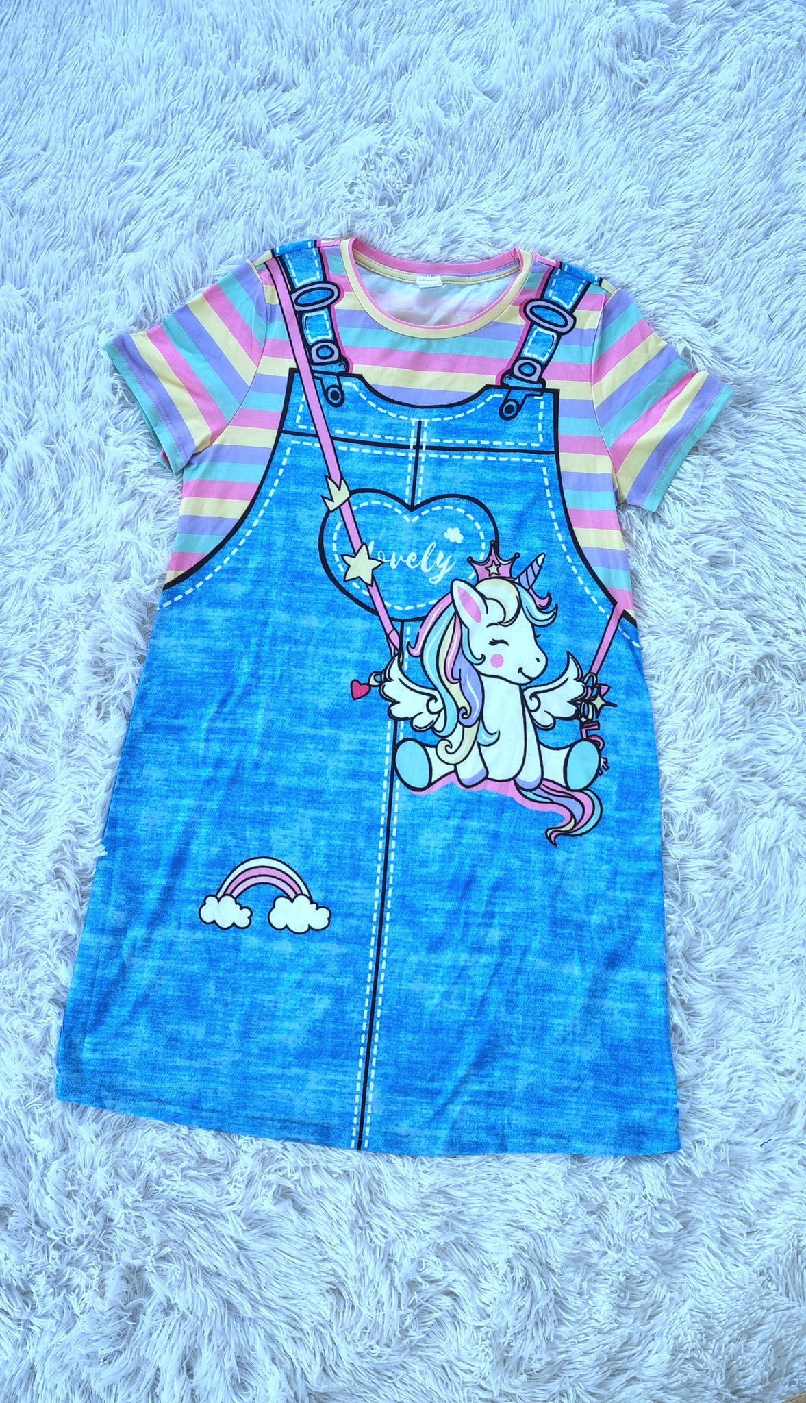 This kids dress features a timeless knitted denim-look with a playful rainbow unicorn print and comfortable round neck design. Your child will love the whimsical and stylish look, while the durable and soft material ensures long-lasting wear. A must-have addition to any little one's wardrobe.